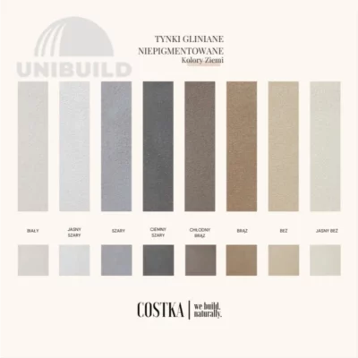 Zestaw próbek – tynki naturalne Costka to 11 opakowań po 1 kg, co pozwala wypróbować technikę autentycznego tynku wapiennego i dobrać kolor do domowych wnętrz. W zestawie znajdują się kolory ziemi (od bieli do głębokiego brązu), a także tynk gliniany bazowy, tynk gliniany strukturalny i tynk wapienny.